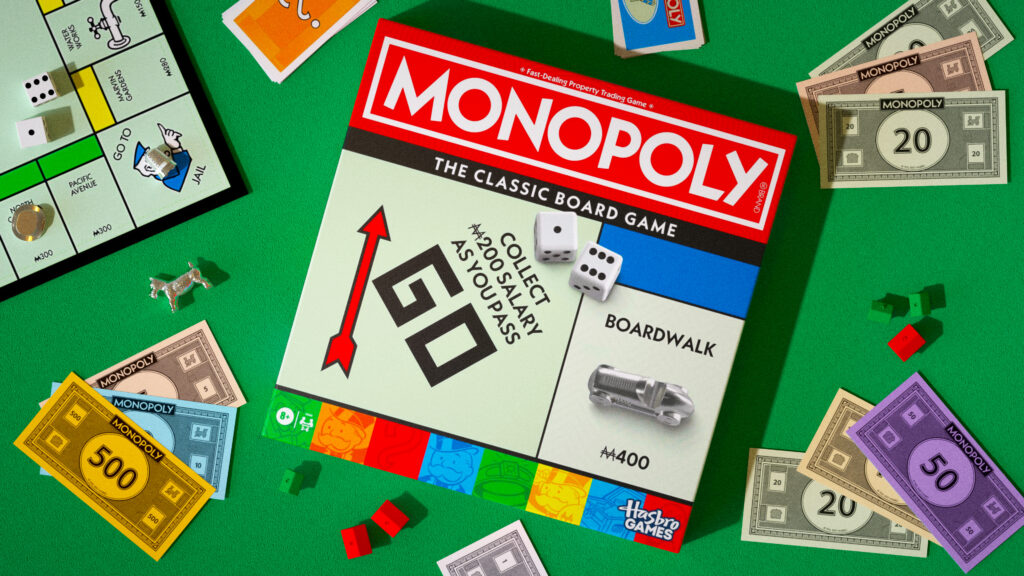 Monopoly zawsze działało wizualnie, bo miało silne, rozpoznawalne elementy: czerwień, charakterystyczną typografię, ikonę Pana Monopoly i kompozycję planszy.